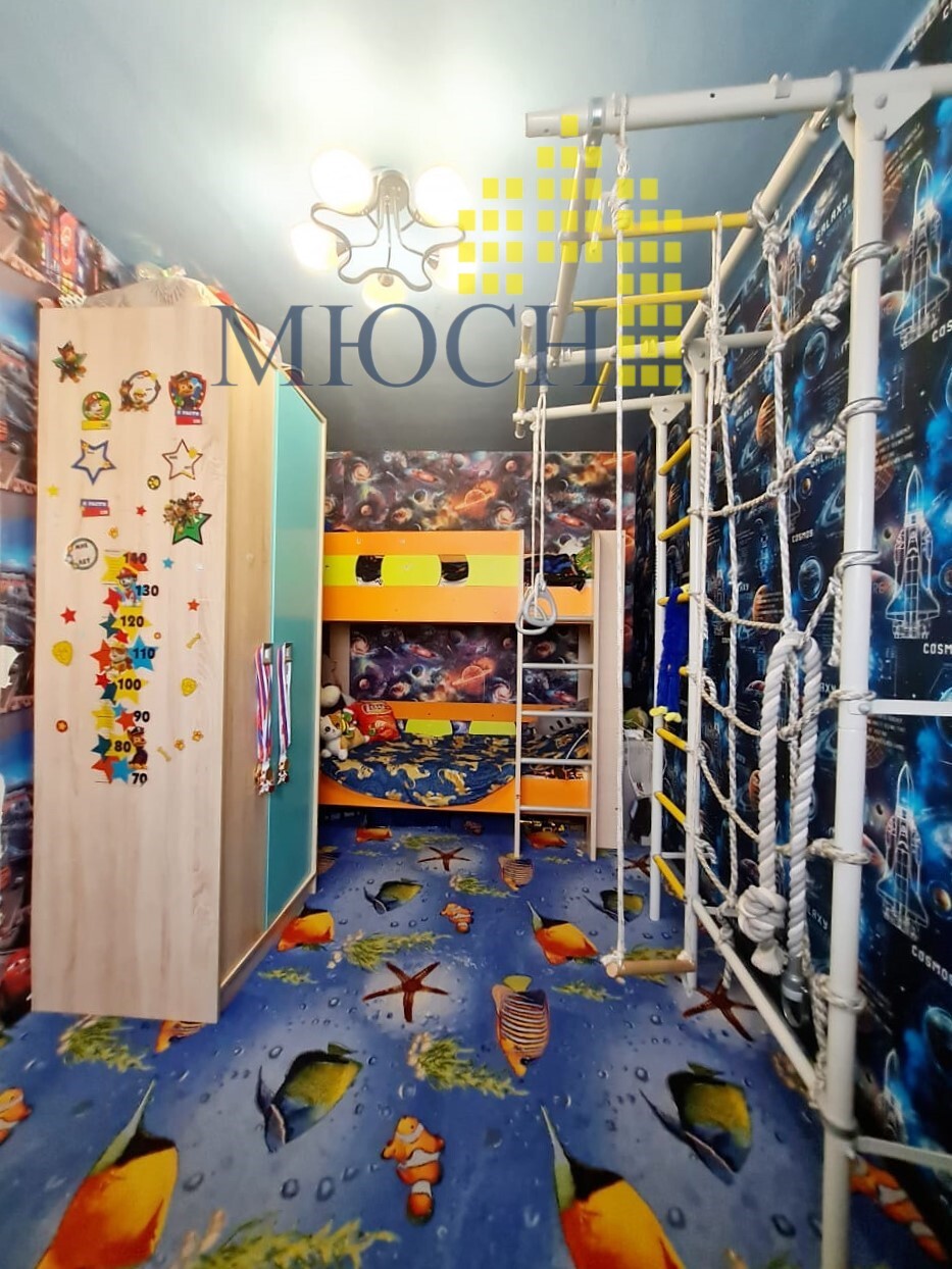 Квартира продается с мебелью и техникой: 2-х ярусная кровать детская, спортивная стенка, шкаф письменный, стол (рабочая зона на 2 человека), мебельная стенка, компьютерный стол, кухонный гарнитур, холодильник, стол кухонный, стулья, СВЧ печь, прихожая.