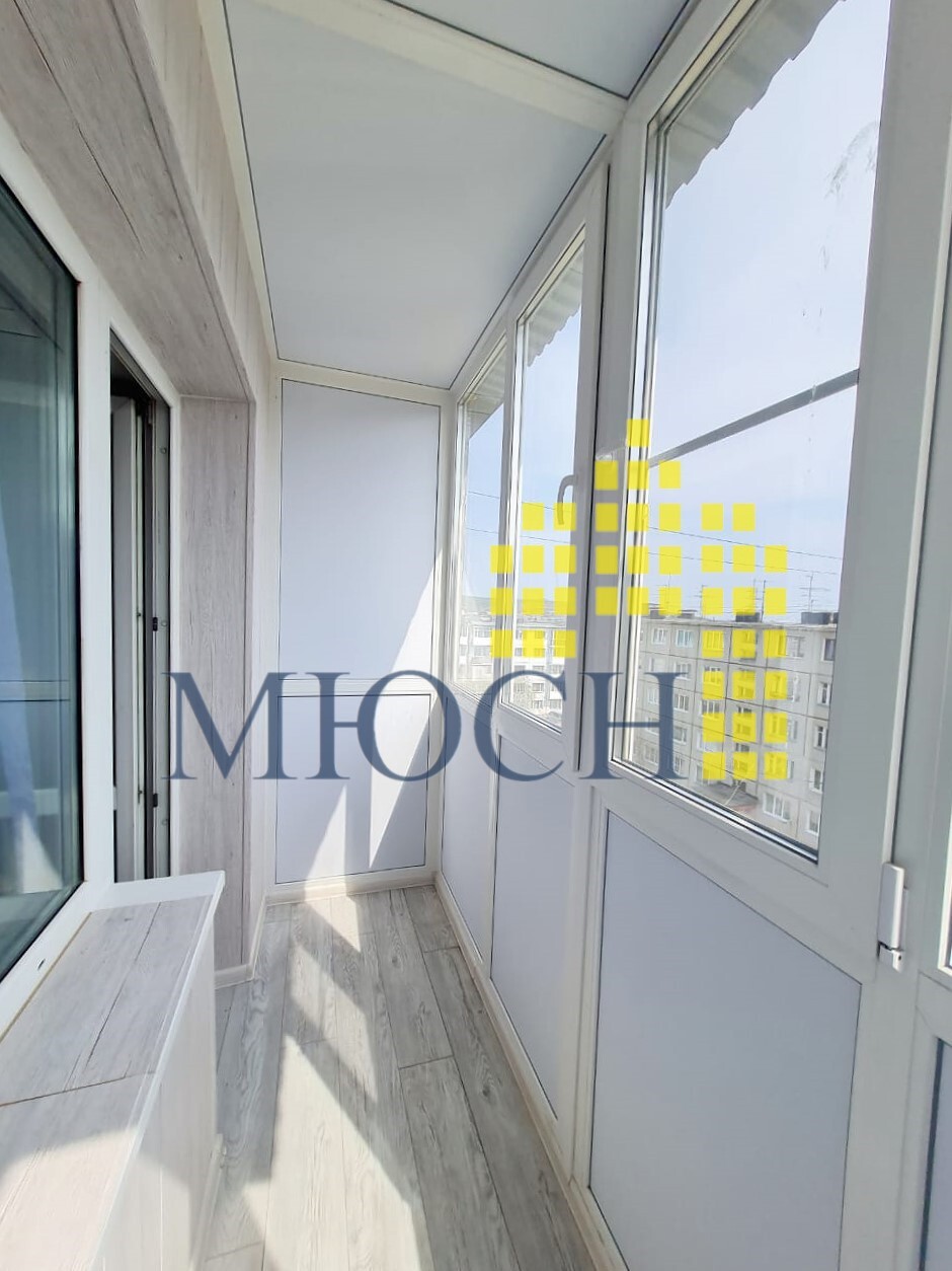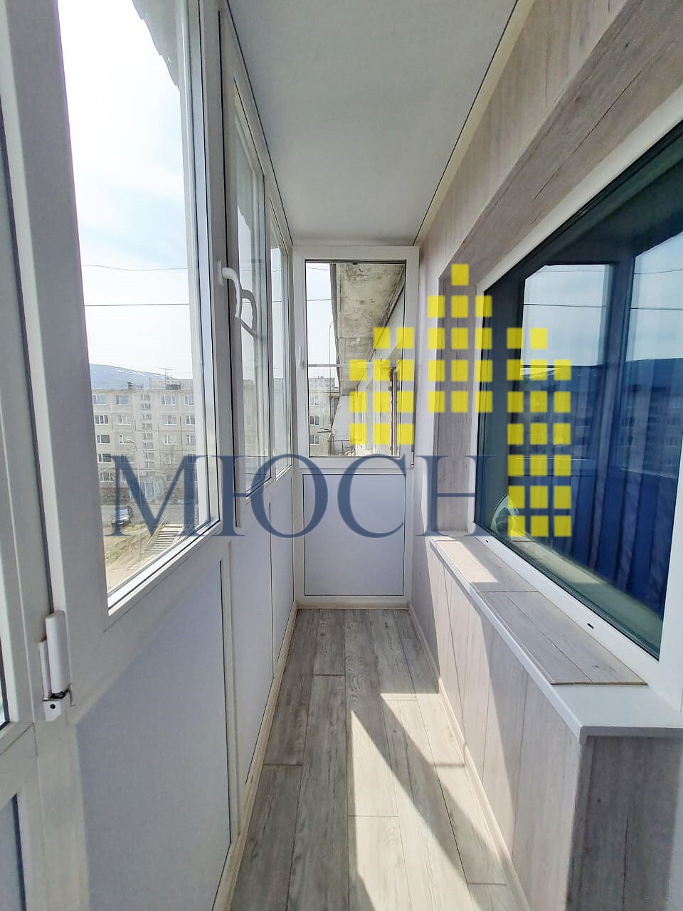 Балкон остеклён стеклопакетом и имеет внутреннюю отделку.