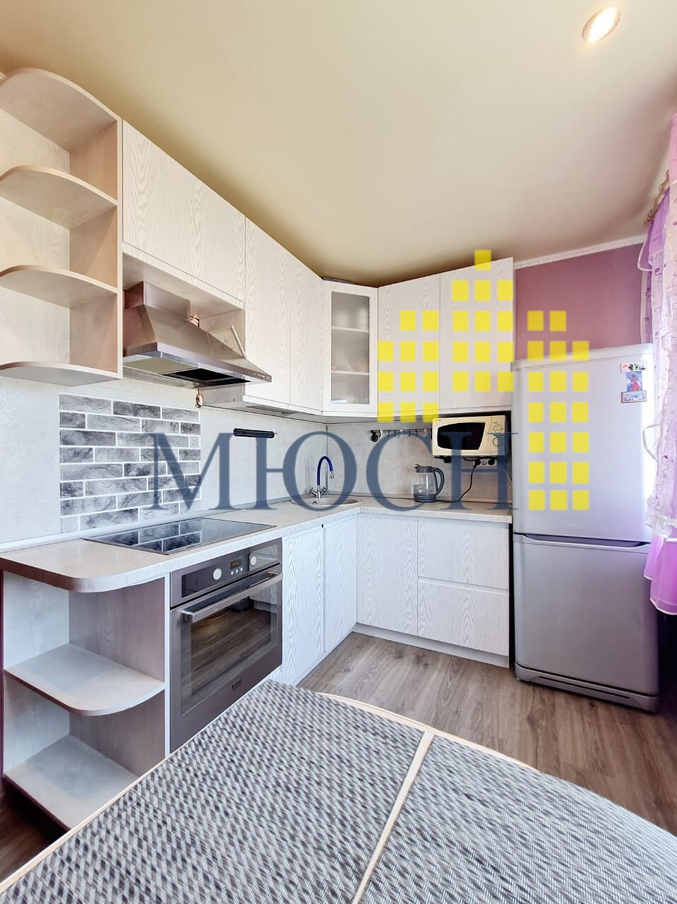При продаже остаётся: стиральная машина, СВЧ печь, холодильник, кухонный гарнитур, варочная панель, духовой шкаф, кухонный стол и стулья, шкаф, два комода, два телевизора, компьютерный стол.