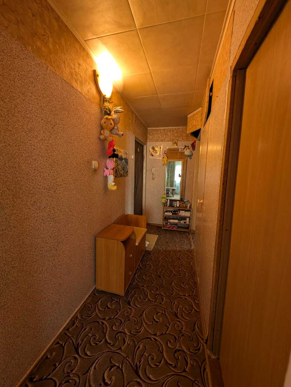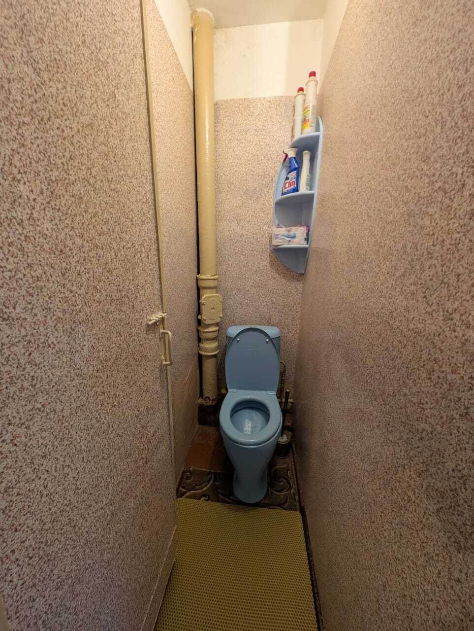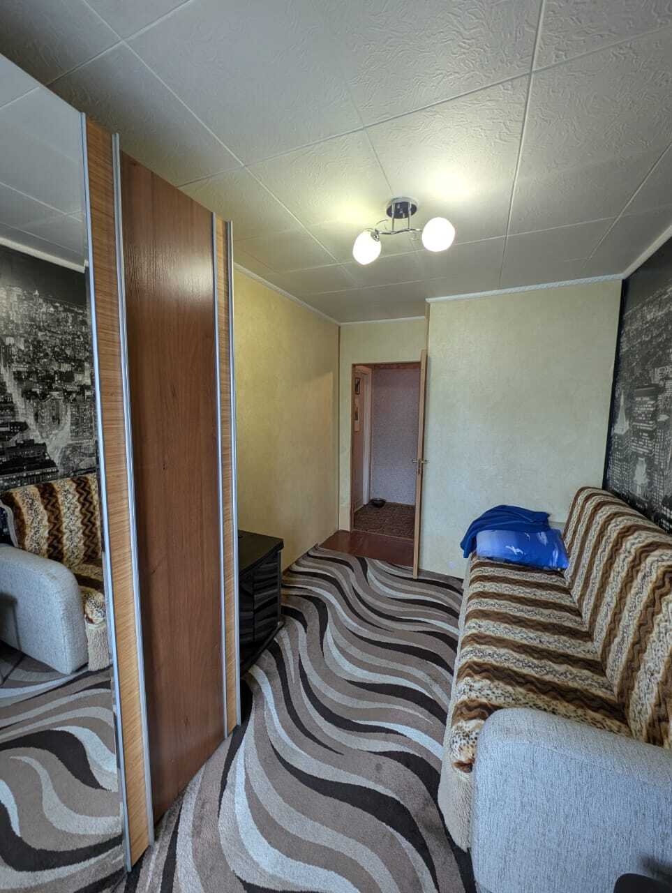 Квартира теплая, светлая, чистая, жилая, сухая. Окна выходят на солнечную сторону. Радиаторы чугунные. Потолки - стиропор. На стенах обои. Полы застелены линолеумом и ковровым покрытием, в ванной кафель. В маленькой комнате выравнены стены. Сантехника частично заменена.